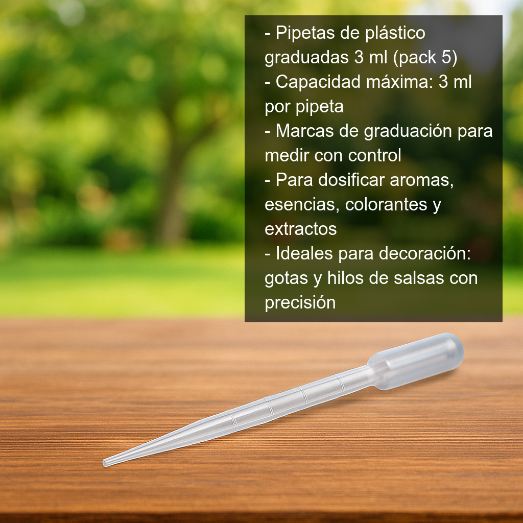 Pipetas de plástico graduadas de 3 ml (pack de 5 unidades) para dosificar y manipular con precisión pequeñas cantidades de líquido en cocina y repostería. Cada pipeta tiene una capacidad máxima de 3 ml e incorpora marcas de graduación para ayudarte a medir de forma controlada.