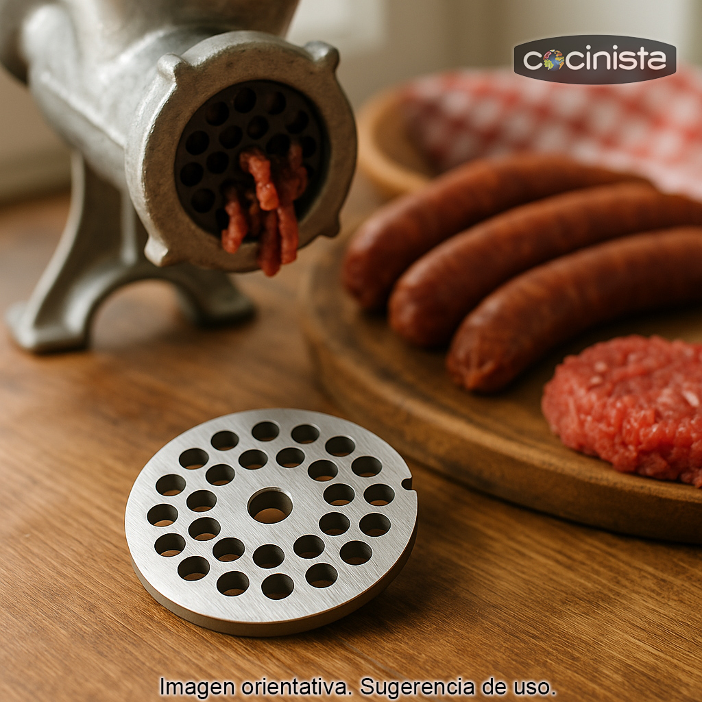 Gracias a sus orificios de 10 mm, obtendrás un resultado perfecto para elaboraciones donde interesa que la carne quede con cuerpo, como por ejemplo chorizo, salchichas rústicas, hamburguesas artesanas o mezclas de carne para rellenos con textura.