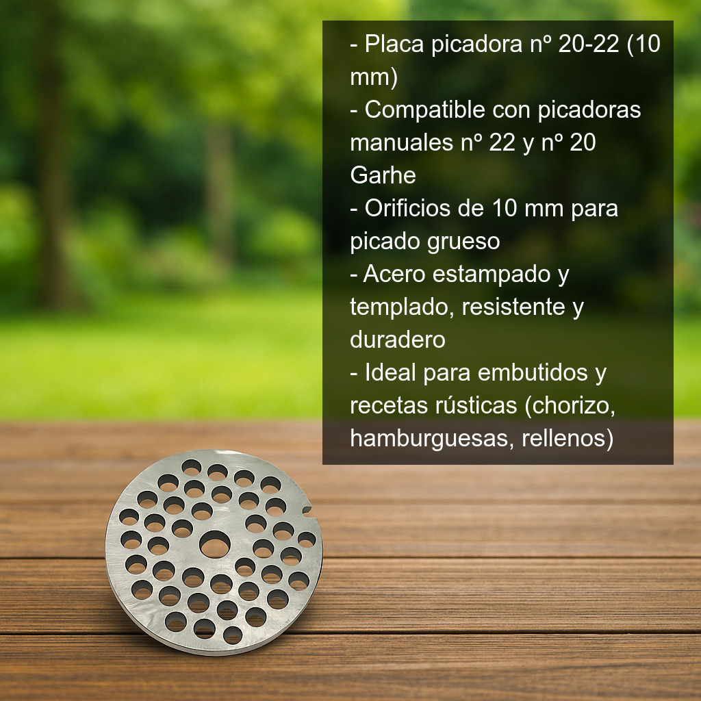 La placa picadora para máquina del nº 20-22 (orificio 10 mm) es un accesorio imprescindible para quienes elaboran embutidos y preparaciones caseras con una textura definida. Diseñada para máquinas manuales picadoras nº 22 y compatible también con el nº 20 de la marca Garhe, esta placa permite conseguir un picado grueso ideal para recetas tradicionales.