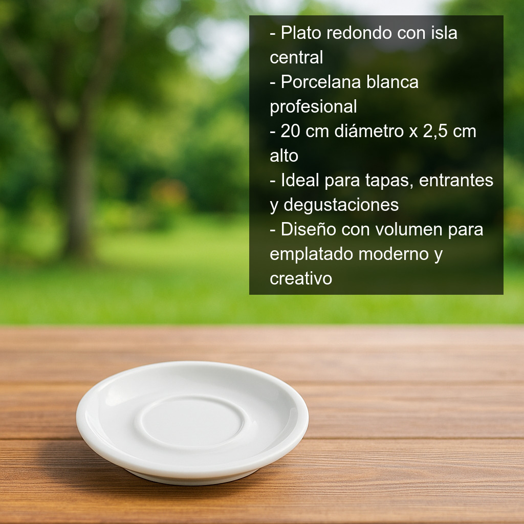 Este plato redondo de porcelana blanca profesional (20 cm de diámetro x 2,5 cm de alto) es una pieza ideal para presentación gastronómica en casa o en hostelería. Su diseño original incorpora una isla central que aporta volumen y personalidad al emplatado, ayudándote a crear composiciones más atractivas y modernas.