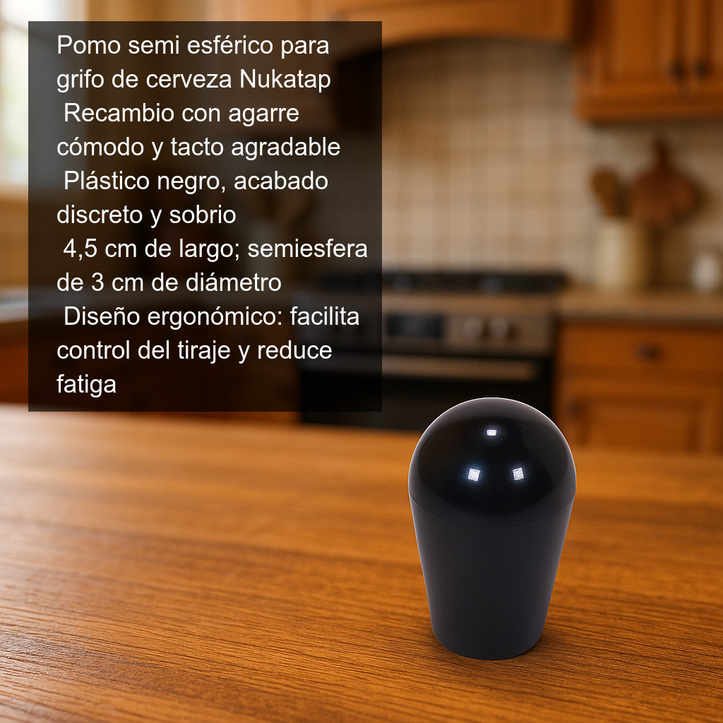 Este pomo semi esférico para grifo de cerveza es un recambio ideal para quienes buscan un agarre cómodo y un acabado discreto en su tirador. Fabricado en plástico negro, ofrece una buena resistencia al uso habitual y un tacto agradable, perfecto tanto para instalaciones domésticas como para barras y equipos de servicio.