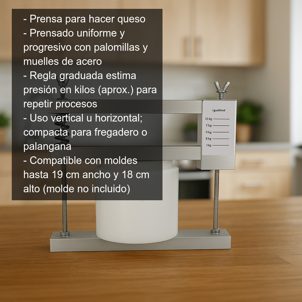 Esta prensa para hacer queso es una herramienta compacta y robusta, pensada para quienes elaboran queso en casa y necesitan un prensado uniforme, controlado y limpio. Fabricada con herrajes de acero inoxidable y tablillas de aluminio, permite aplicar presión de forma progresiva sobre el molde para expulsar el suero y conseguir una textura final más firme y homogénea.