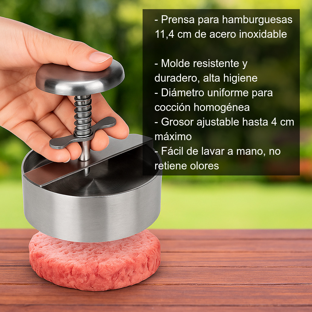 Su composición en acero inoxidable garantiza una excelente higiene, no retiene olores y resulta fácil de lavar a mano. Una herramienta práctica para quienes buscan preparar hamburguesas caseras de forma rápida, limpia y con un resultado uniforme.