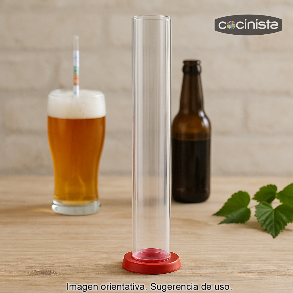 Su diseño alto y estrecho permite introducir el densímetro con comodidad y obtener una lectura estable, ayudando a controlar parámetros clave como la densidad inicial y final, el seguimiento de azúcares y la evolución del proceso.