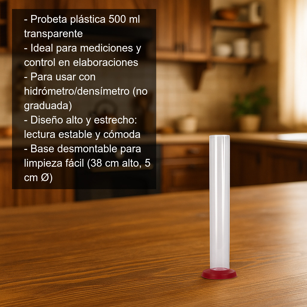 Probeta de plástico transparente de 500 c.c (500 ml) ideal para realizar mediciones y controles en procesos de elaboración casera y profesional. Aunque no está graduada, este tipo de probeta se utiliza habitualmente junto con un hidrómetro/densímetro del tamaño adecuado para medir la densidad y el avance de la fermentación en líquidos como mostos, cerveza, vino, sidra, kombucha u otras bebidas.