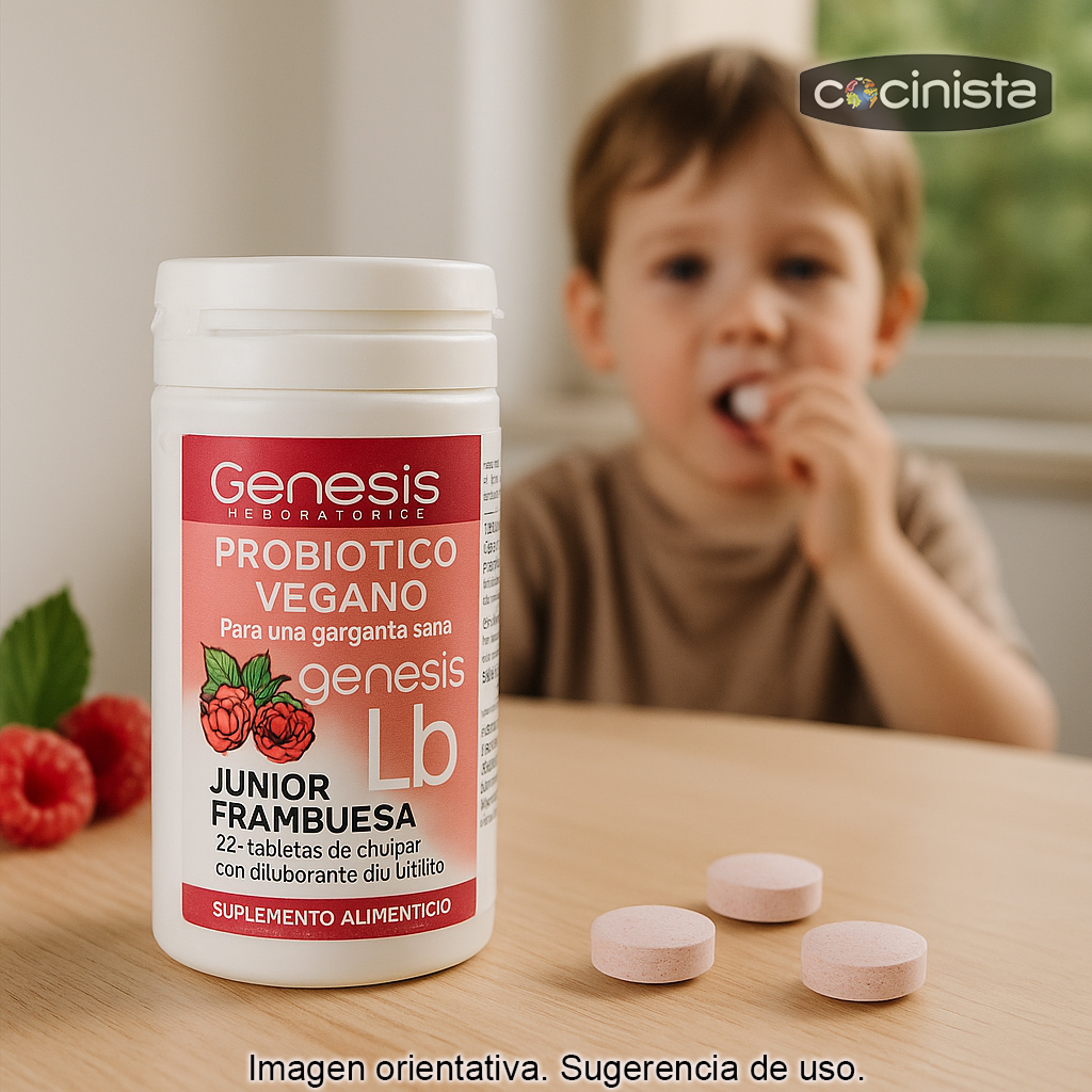 Según el fabricante, Genesis LB está indicado como apoyo en procesos inflamatorios de garganta y para el cuidado de la cavidad bucal, además de contribuir a mantener la microbiota intestinal en equilibrio. Al tratarse de tabletas chupables, el producto se mantiene más tiempo en contacto con la boca y la garganta, lo que lo convierte en una opción interesante cuando se desea un soporte probiótico en estas zonas.