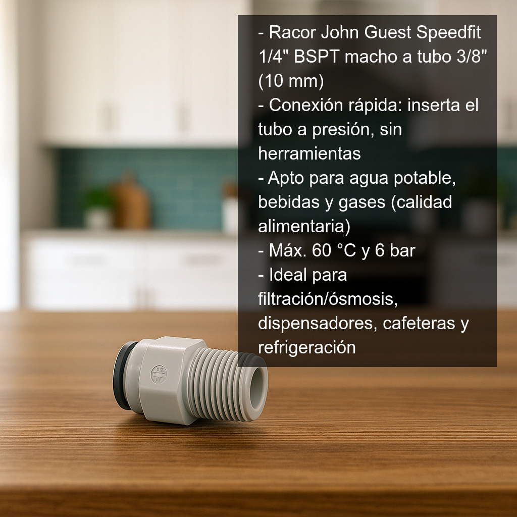 El racor John Guest Speedfit rosca macho 1/4" BSPT a tubo 3/8" (10 mm) es un conector rápido diseñado para realizar uniones seguras y estancas en instalaciones de agua, bebidas y gases. Es una solución muy utilizada en sistemas de filtración, ósmosis inversa, dispensadores, cafeteras, equipos de refrigeración y líneas de suministro donde se requiere una conexión fiable y fácil de mantener.