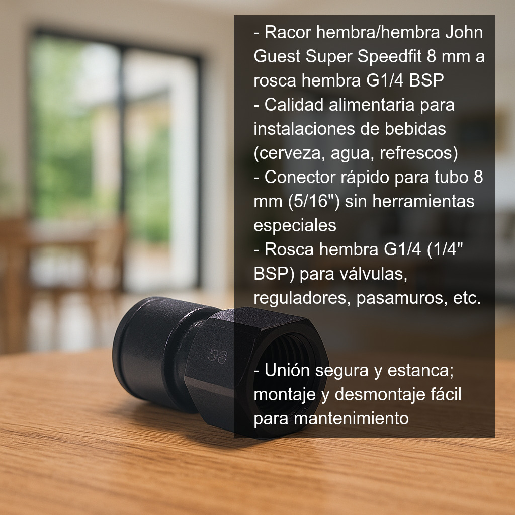 Este racor es especialmente útil en montajes de tiradores de cerveza, equipos de ósmosis, enfriadores, dispensadores y líneas de bebida donde se utilice tubo de 8 mm (5/16") y se necesite conectar a una rosca hembra 1/4" BSP (G1/4).