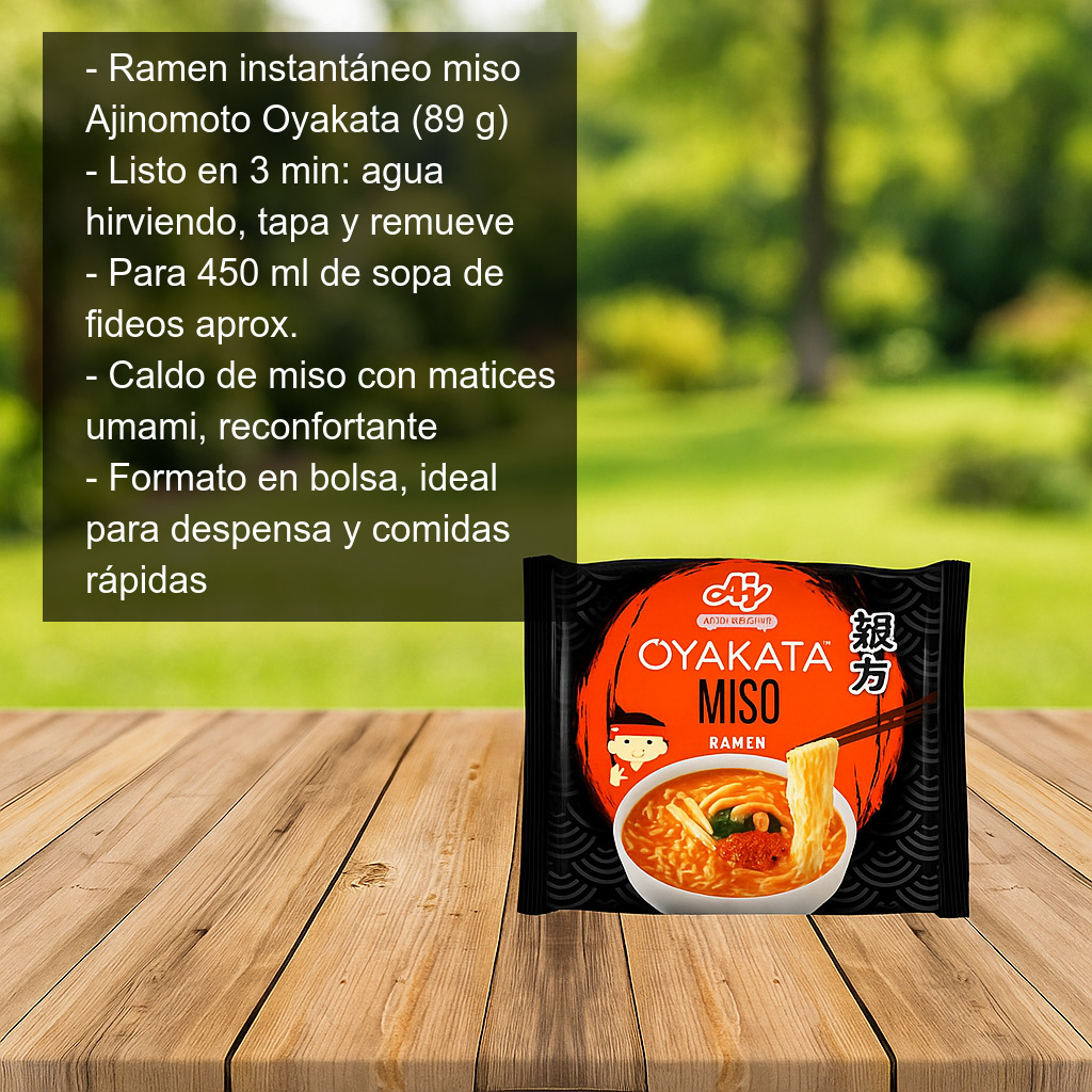 Ramen instantáneo sabor miso (89 g) de la reconocida marca Ajinomoto, dentro de su popular gama de fideos japoneses Oyakata. Una opción práctica y sabrosa para disfrutar en casa de una sopa ramen con el característico toque del miso: un caldo con matices umami, reconfortante y perfecto para una comida rápida sin renunciar al sabor.