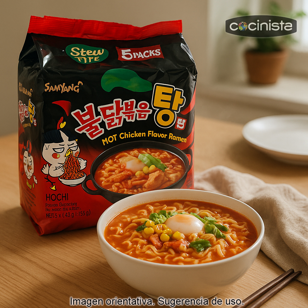 Este ramen pertenece a la popular familia de sopas Buldak de Samyang, cuyo nombre significa literalmente “pollo picante”, famosa por su sabor potente y su picante característico.