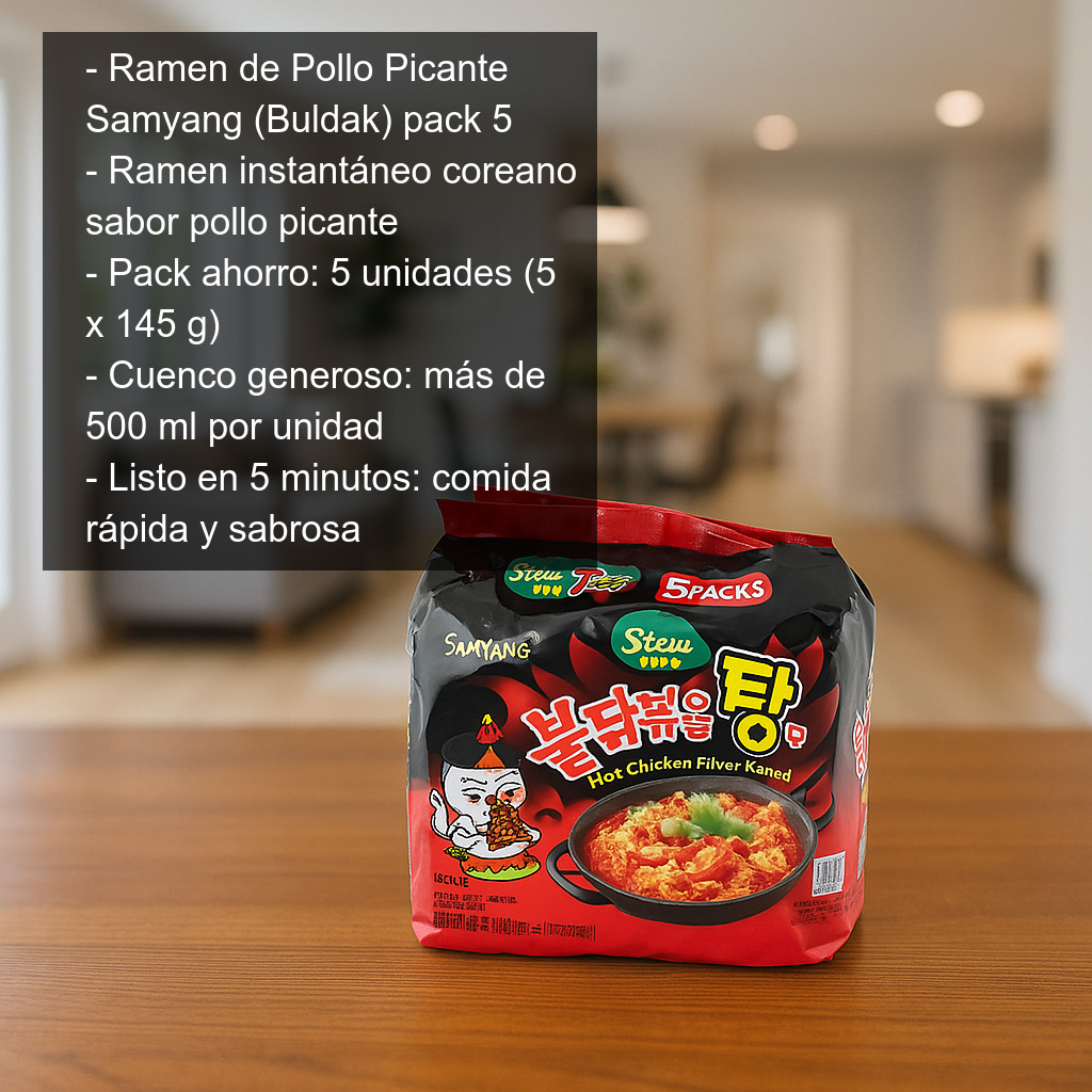 Disfruta en casa de un cuenco intenso y reconfortante con el Ramen de Pollo Picante Samyang (Buldak), un preparado de fideos tipo ramen instantáneos con el inconfundible sabor coreano a pollo picante. Este formato pack ahorro de 5 unidades (5 x 145 g) es ideal para tener siempre a mano una comida rápida, sabrosa y con un toque picante característico.