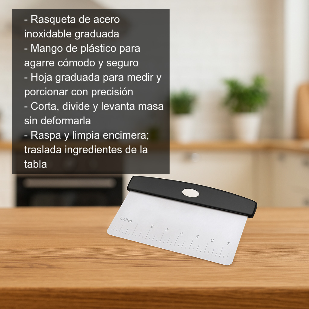 Además de trabajar masas, su uso va mucho más allá: es excelente para recoger verduras, hierbas o carne picada y llevarlas de la tabla al bol o a la sartén sin ensuciar. También resulta muy útil para raspar restos de harina, masa o ingredientes adheridos a la encimera o a la tabla, ayudándote a mantener el área de trabajo ordenada. La graduación de la hoja aporta un extra de control al cortar porciones similares o al calcular anchos aproximados al estirar y plegar.