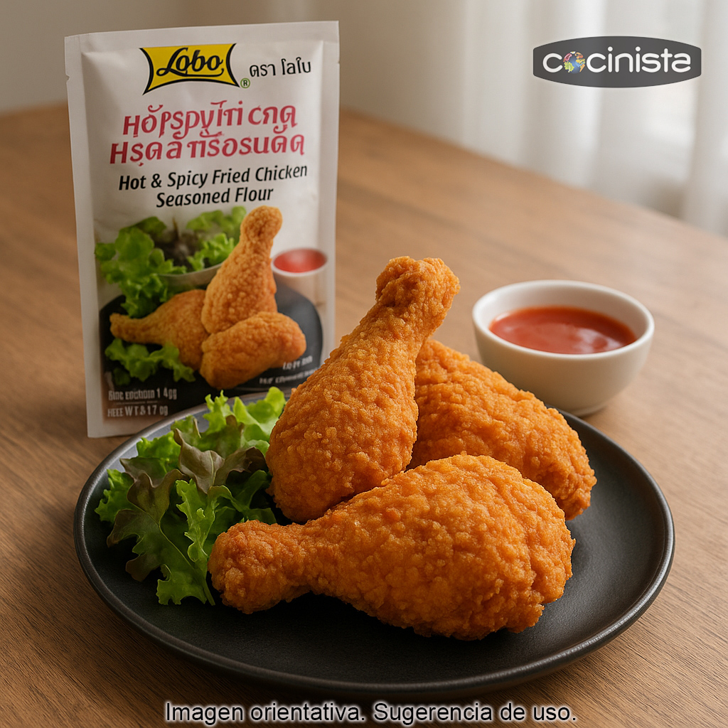 Consigue en casa un pollo frito crujiente y con un toque picante al estilo tailandés con este rebozado picante para pollo (150 g). Es una mezcla especialmente formulada con especias, chiles y harinas para lograr un exterior dorado y muy crujiente, con un interior jugoso y lleno de sabor.