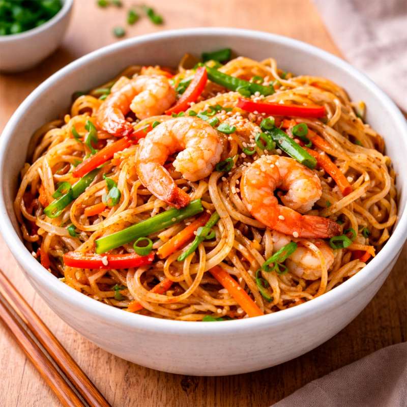 Obtendrás un chow mein de gambas jugoso, aromático y lleno de textura, con el contraste perfecto entre las verduras salteadas, la suavidad de las gambas y el sabor profundo de la salsa oriental. Es una receta ideal para una cena rápida, una comida especial entre semana o incluso para incluirla en contenidos de recetas orientados a posicionar productos de cocina asiática.