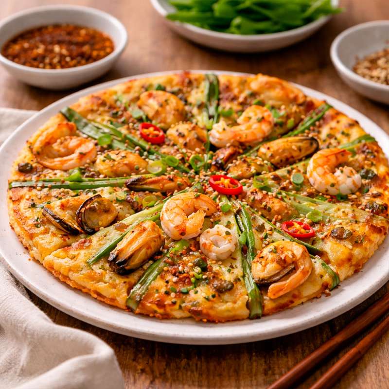 Cocina durante unos 4 o 5 minutos a fuego medio hasta que la base esté bien dorada. Dale la vuelta con cuidado, añadiendo un poco más de aceite si hace falta, y cocina otros 4 o 5 minutos por el otro lado. El objetivo es que el Haemul Pajeon quede dorado, crujiente en los bordes y bien hecho por dentro.
