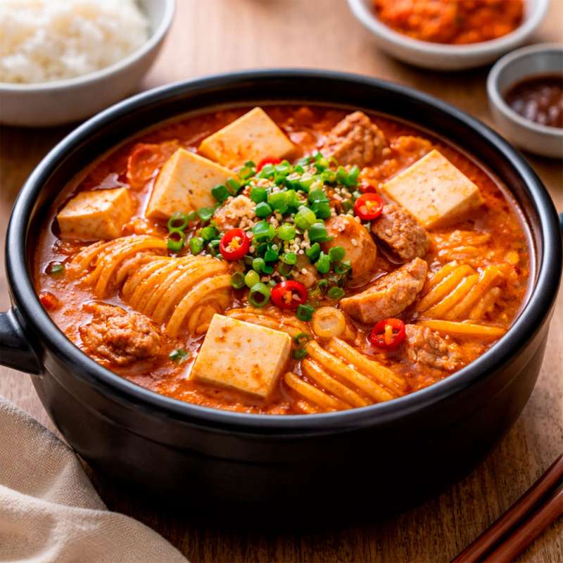 Añade las cebolletas en los últimos 2 minutos de cocción. Sirve el Kimchi Jjigae bien caliente, idealmente acompañado de arroz blanco. Si quieres, puedes terminar con más cebolleta picada o unas semillas de sésamo.