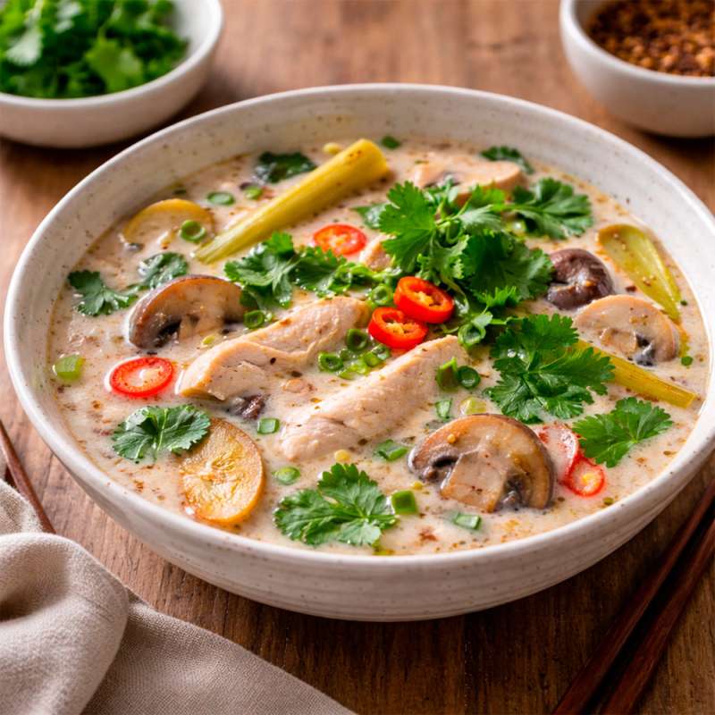 Sirve el Tom Kha Gai bien caliente con cilantro fresco por encima y, si quieres, un poco de cebolleta picada. Puedes acompañarlo con arroz jazmín si lo quieres convertir en un plato más completo.