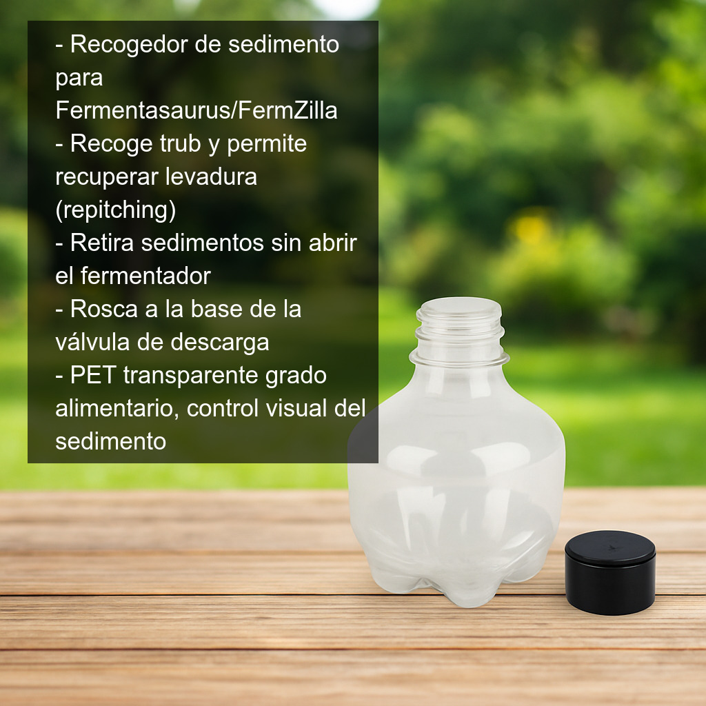 El recogedor de sedimento para Fermentasaurus es la botella/recipiente de repuesto que se atornilla en la base de la válvula de descarga del fermentador para recoger el sedimento (trub) y recuperar la levadura de forma cómoda y segura. Es un accesorio imprescindible si buscas mejorar el control de tus fermentaciones y obtener bebidas más limpias sin trasvases innecesarios.