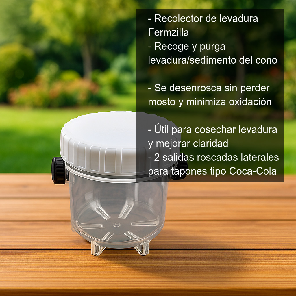 El recolector de levadura Fermzilla es un accesorio imprescindible para quienes buscan un proceso de fermentación más limpio, controlado y eficiente en sus elaboraciones de cerveza artesanal. Diseñado específicamente para los fermentadores Fermzilla, este recipiente permite recoger y purgar la levadura acumulada en el cono, así como realizar adiciones de ingredientes con mayor seguridad y sin comprometer la cerveza.