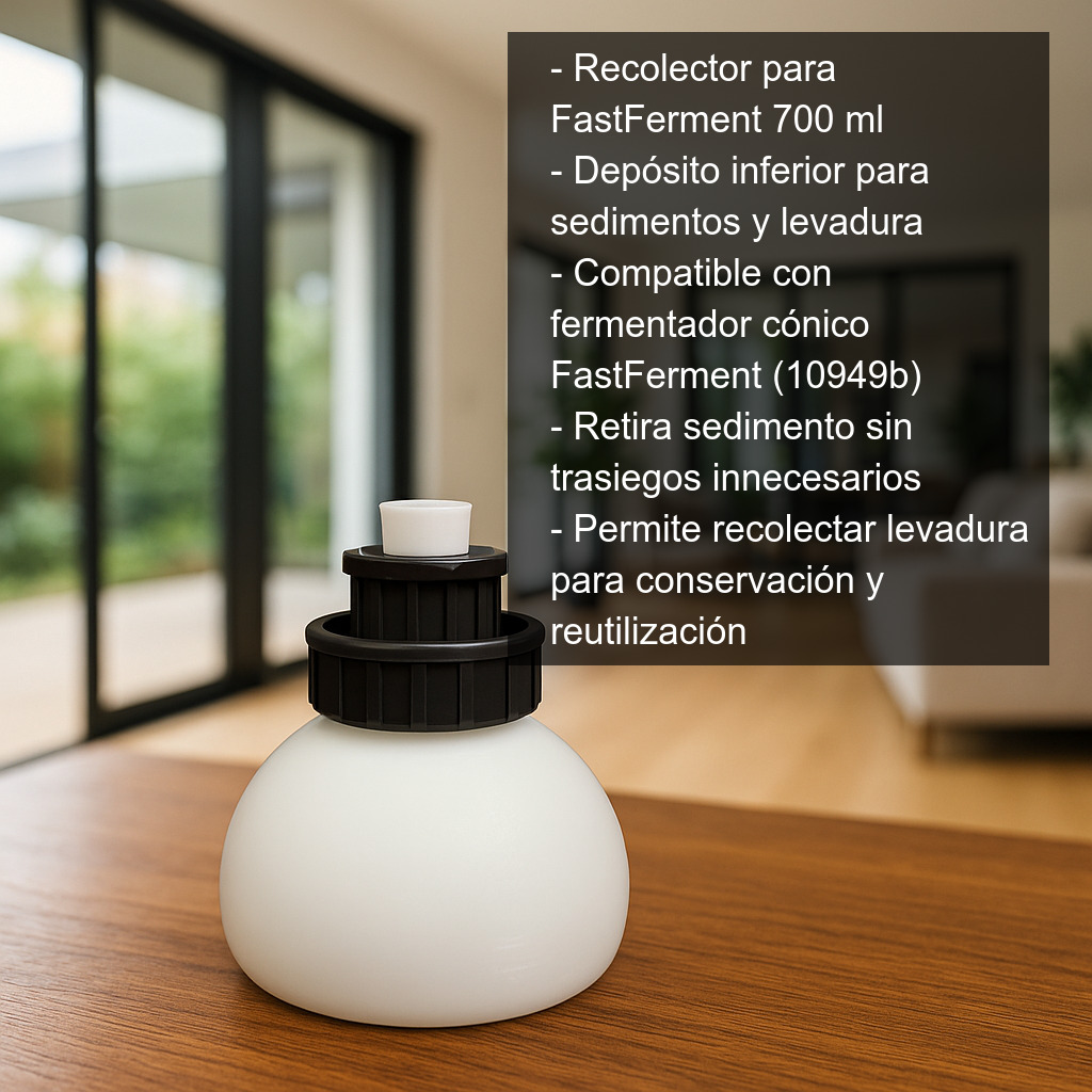 El recolector para FastFerment de 700 ml es el depósito recolector de sedimentos diseñado para el fermentador cónico FastFerment (ref. Cocinista 10949b). Se acopla en la parte inferior del fermentador para separar y recoger con facilidad los posos generados durante la fermentación, mejorando la limpieza del proceso y facilitando el trabajo en cada lote.
