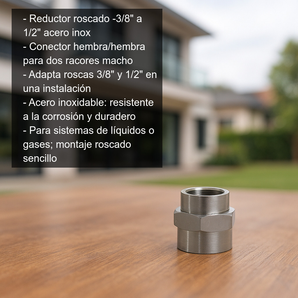 El reductor roscado -3/8" a 1/2" es un conector hembra/hembra de acero inoxidable diseñado para unir de forma segura dos racores macho con diámetros distintos: 3/8" y 1/2". Es la pieza ideal cuando necesitas adaptar una instalación existente, ampliar un circuito o integrar componentes con roscas de diferente medida manteniendo una conexión firme y estanca.