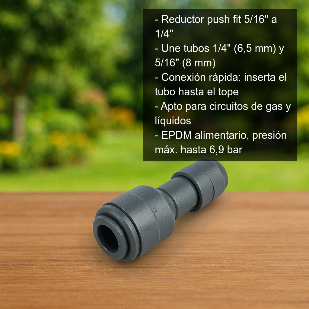 Si necesitas adaptar una instalación de tubo 5/16" a 1/4" (o viceversa) con un conector fiable y de montaje rápido, este reductor push fit es una opción robusta y segura para tus circuitos de gas o líquidos.