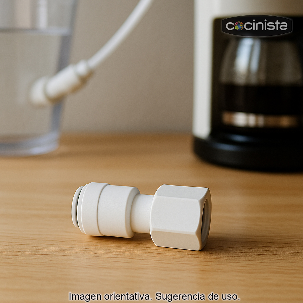 Este adaptador es especialmente útil en sistemas donde se necesita pasar de una línea de tubo de 3/8" a accesorios con rosca flare 1/4", como en dispensadores de agua, equipos de filtración, ósmosis, máquinas de café, enfriadores y instalaciones de bebidas en general.