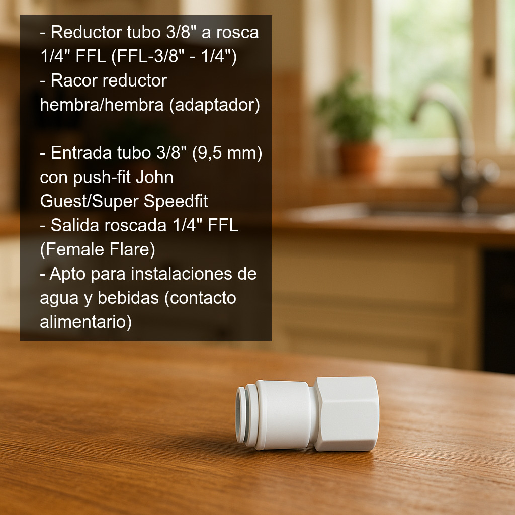 El reductor tubo 3/8" a rosca 1/4" FFL (FFL-3/8" - 1/4") es un racor hembra/hembra de calidad alimentaria, ideal para realizar adaptaciones rápidas y seguras en instalaciones de bebidas y agua. Permite conectar un tubo de 3/8" (9,5 mm) mediante conector rápido tipo John Guest / Super Speedfit a una rosca 1/4" FFL (Female Flare), facilitando la compatibilidad entre distintos componentes del circuito.
