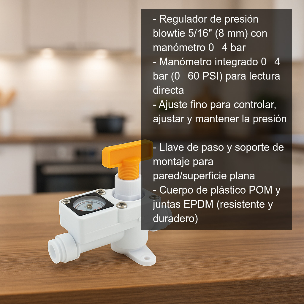Este regulador de presión para tubo de 5/16" (8 mm) con manómetro integrado de 0 a 4 bar (0–60 PSI) es una solución práctica y precisa para controlar, ajustar y mantener la presión en sistemas de fermentación y servicio. Es el tipo de regulador conocido como blowtie (en inglés), muy utilizado en fermentación presurizada, spunding y control de contrapresión en fermentadores y barriles Cornelius/kegs.