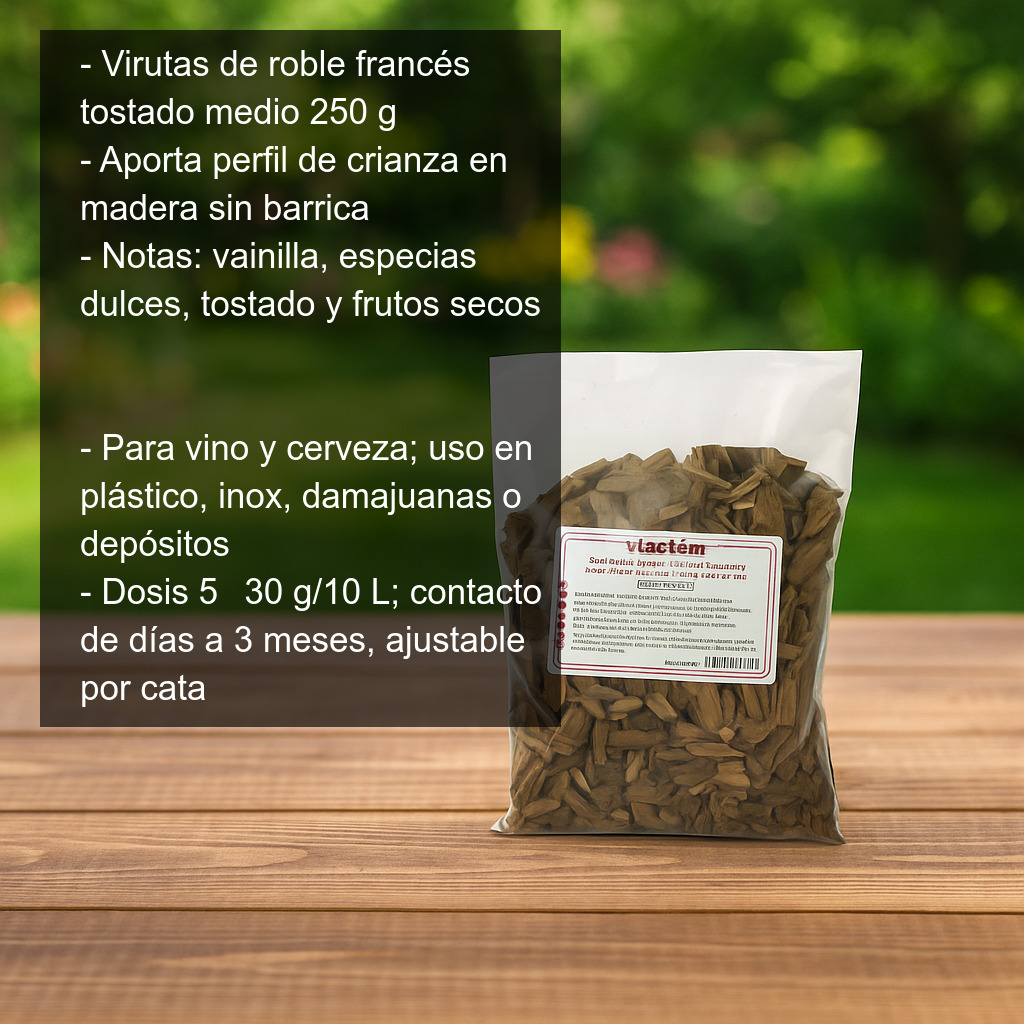 Dale a tu vino o cerveza un auténtico perfil de crianza en madera sin necesidad de barricas. Estas virutas de roble francés tostado medio (chips de roble) están elaboradas con roble francés y aportan de forma rápida y controlable los matices clásicos de la madera: vainilla, especias dulces, notas tostadas, frutos secos y un extra de complejidad aromática.