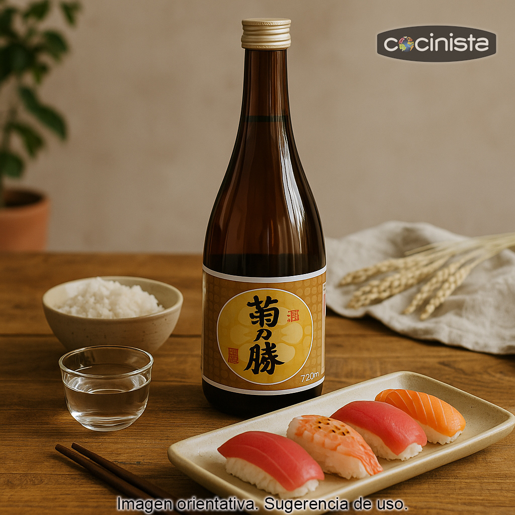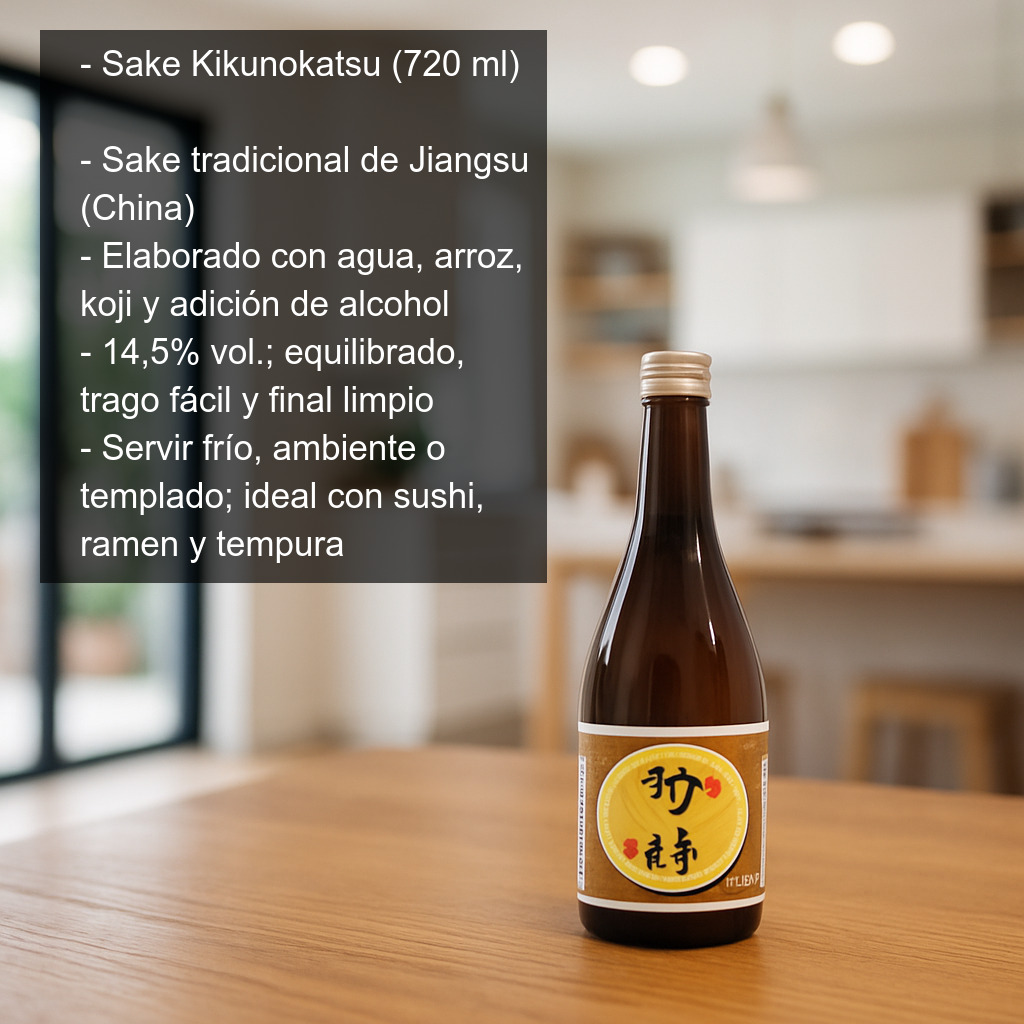 El Sake Kikunokatsu es un sake de estilo tradicional elaborado en la región china de Jiangsu. Se produce a partir de una receta clásica a base de agua, arroz, fermento koji y una pequeña adición de alcohol, un método habitual en muchos sakes para afinar el perfil aromático y aportar una sensación más limpia y ligera en boca.