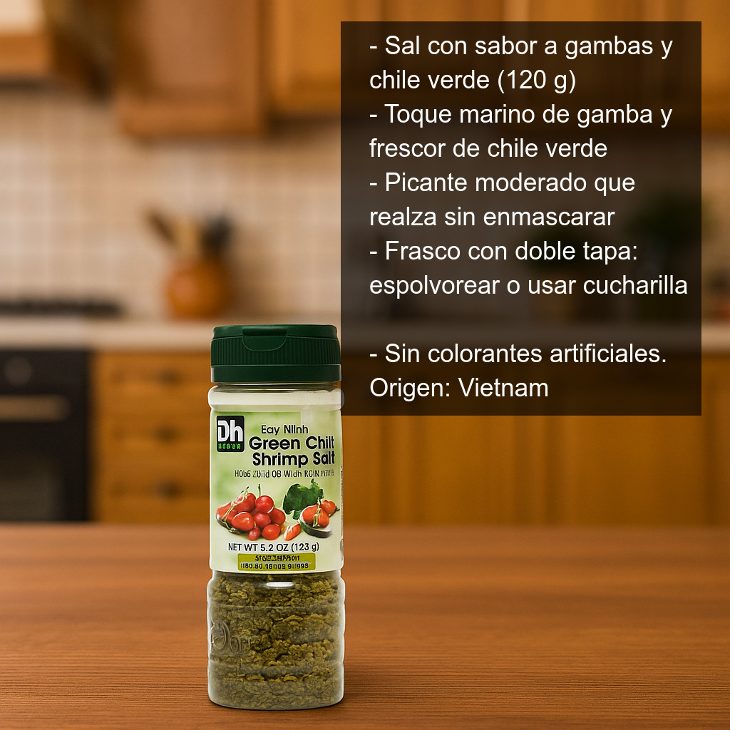 La sal con sabor a gambas y chile verde (120 g) es un condimento aromatizado ideal para quienes buscan una alternativa a la sal común con un extra de sabor. Combina el inconfundible toque marino de la gamba con el matiz fresco del chile verde, aportando un picante moderado que realza los platos sin enmascararlos.