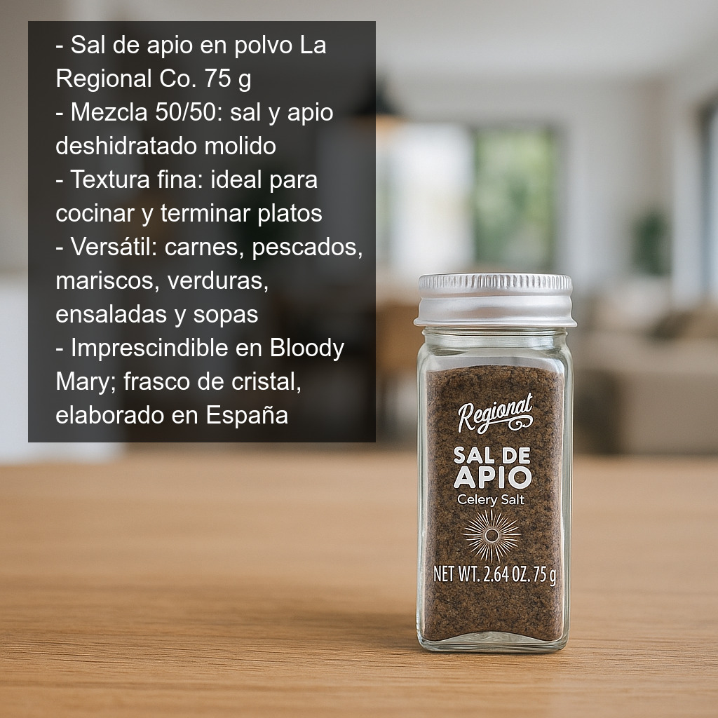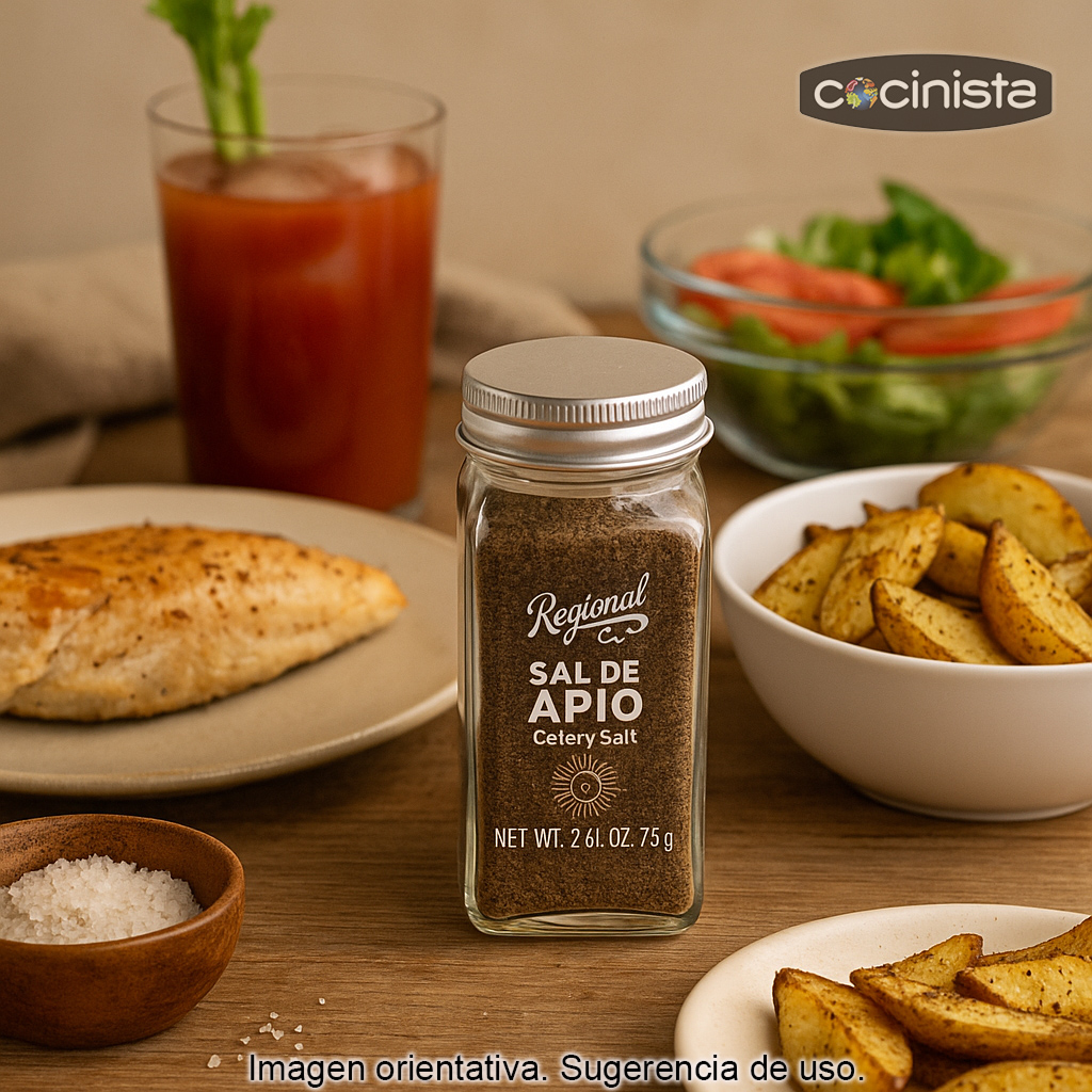 La sal de apio es un condimento imprescindible en la cocina norteamericana y un básico de despensa para quienes buscan dar un toque aromático y ligeramente vegetal a sus platos. Su sabor combina el punto salino con el perfume característico del apio, aportando profundidad sin necesidad de añadir más especias. Es un sazonador muy versátil que acompaña especialmente bien carnes, aves, pescados, mariscos, verduras, patatas, ensaladas y sopas, y es el toque clásico para un auténtico cóctel Bloody Mary.