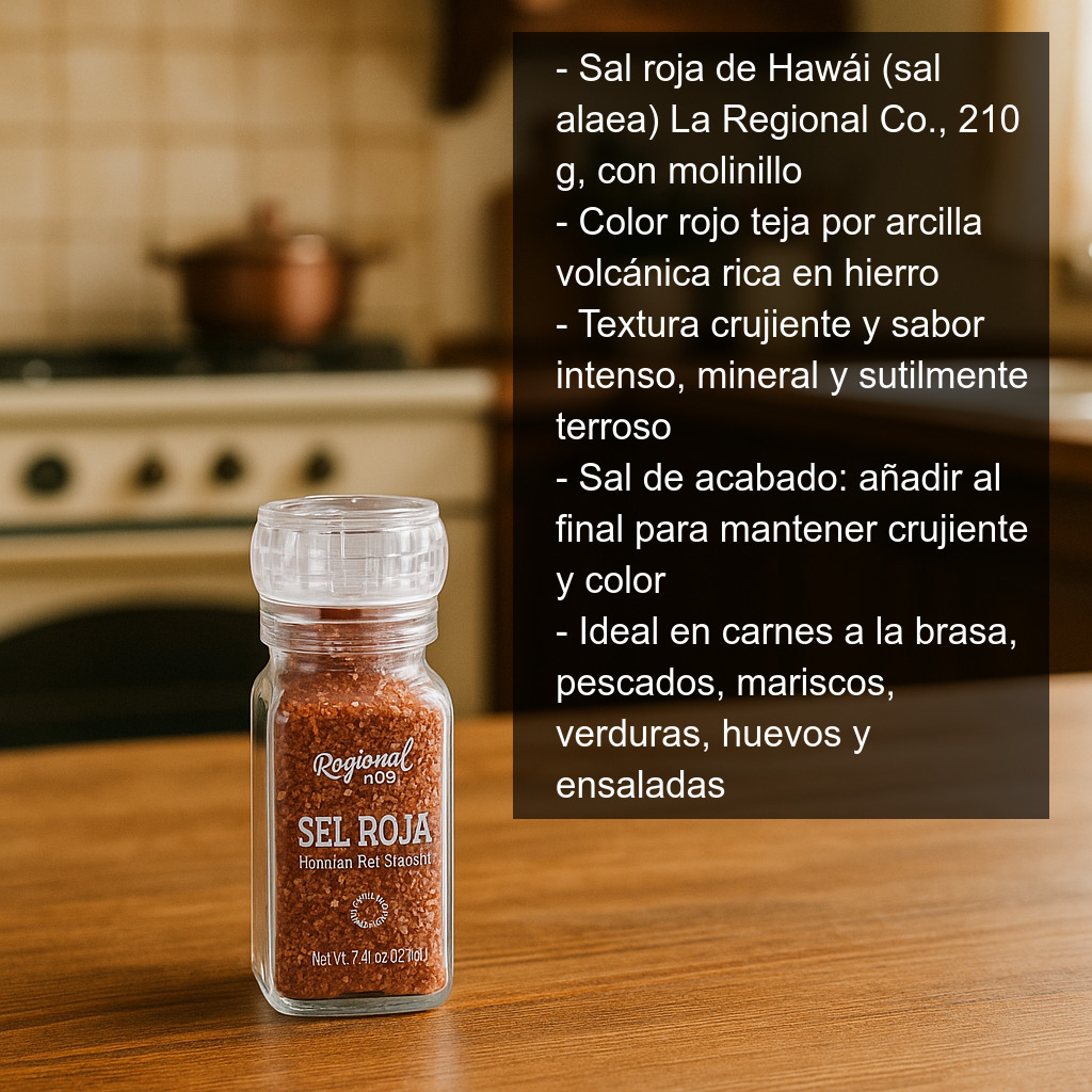 Esta sal se elabora a partir de sal marina que se combina con la arcilla ?alaea, considerada tradicionalmente “sagrada” en Hawái. El resultado es una sal de acabado (finishing salt) perfecta para dar un toque final a los platos, realzando el sabor y aportando un contraste visual espectacular en el emplatado.