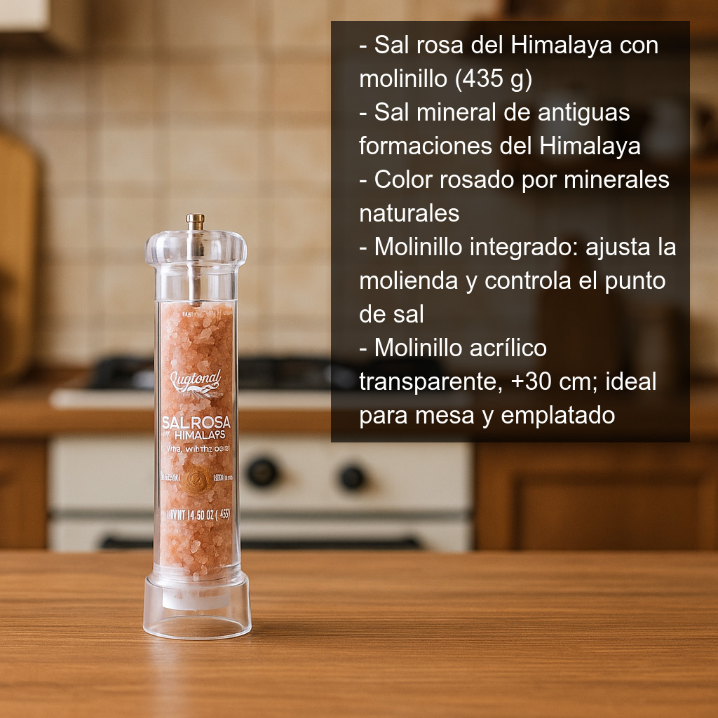 La sal rosa del Himalaya con molinillo (435 g) es una sal mineral extraída de antiguas formaciones salinas en la región del Himalaya. Su característico color rosado se debe a la presencia natural de minerales. Es una sal muy apreciada en cocina por su sabor intenso y por aportar un toque final elegante tanto en la mesa como en el emplatado.
