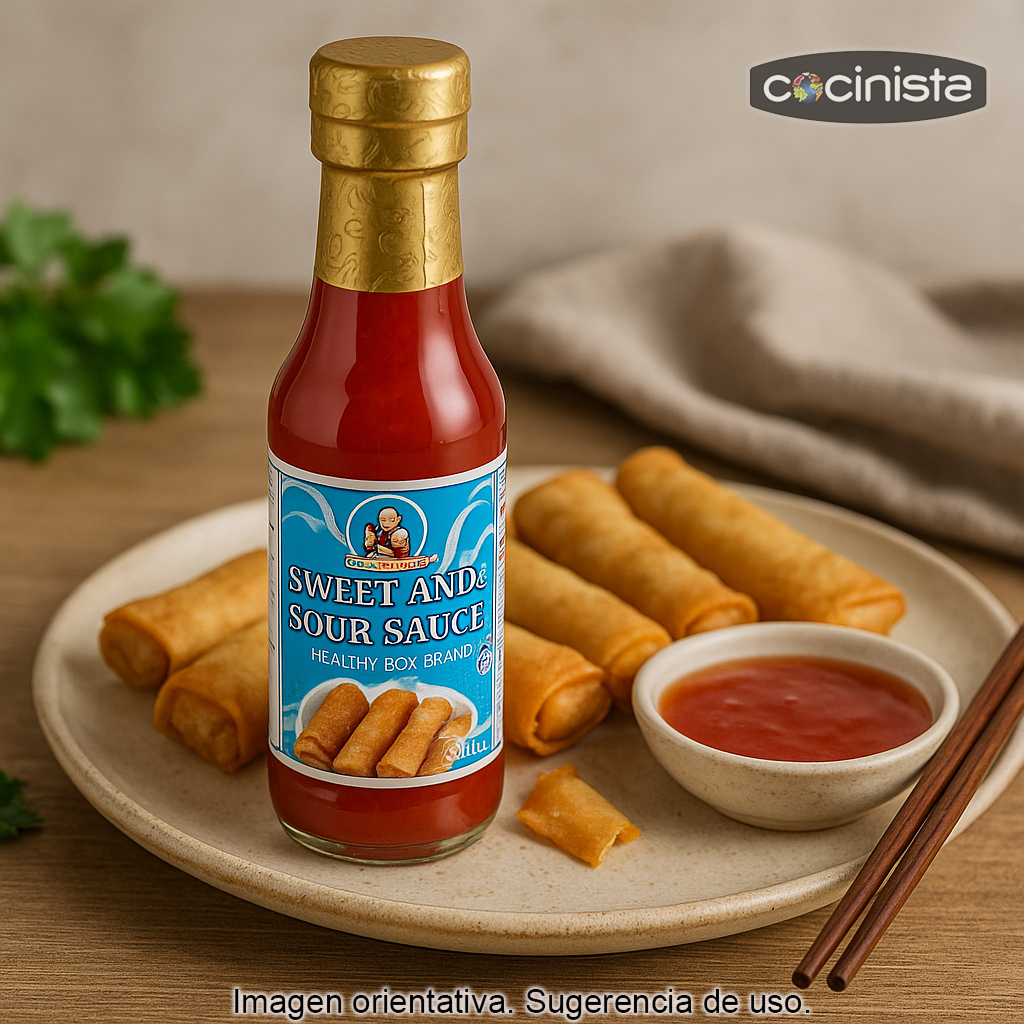 Ten siempre a mano este frasco de salsa agridulce tailandesa y dale a tus platos ese equilibrio irresistible entre dulce y ácido tan característico de la cocina asiática. Es la salsa clásica para mojar rollitos de primavera, pero también funciona de maravilla como acompañamiento, glaseado o dip para muchísimas recetas del día a día.