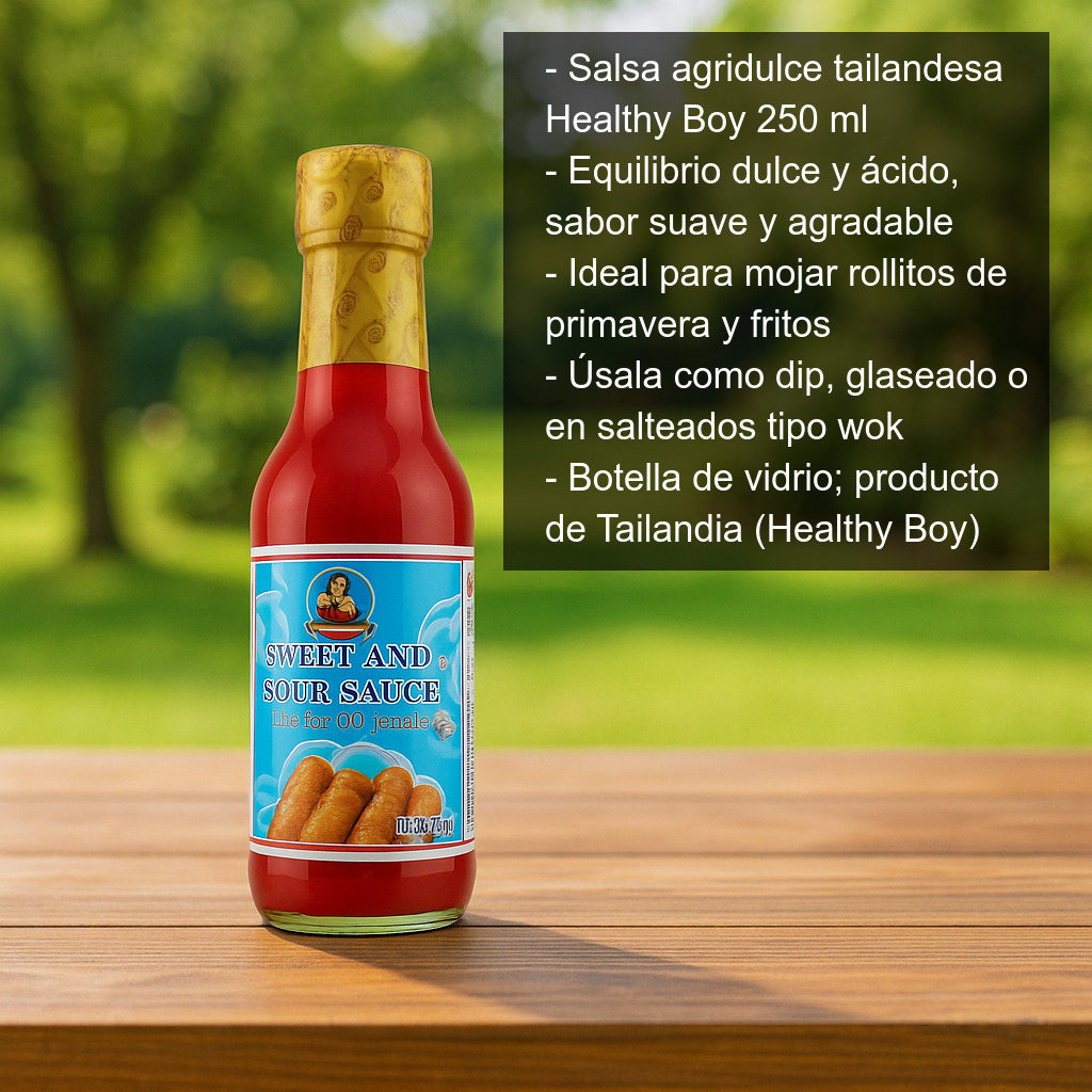 La salsa agridulce Healthy Boy se presenta en botella de vidrio con 250 ml de contenido. Producto de Tailandia, elaborada por Healthy Boy.
