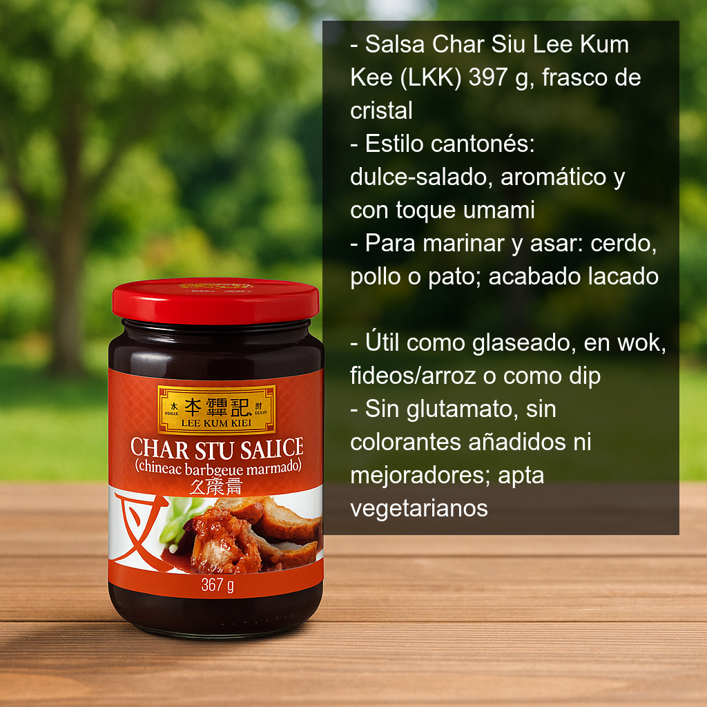 La Salsa Char Siu de Lee Kum Kee (LKK) es una auténtica salsa china estilo cantonés, presentada en frasco de cristal de 397 g, ideal para preparar en casa el clásico Char Siu: el famoso asado chino de color rojizo y sabor ligeramente dulce, muy aromático y con un toque umami.