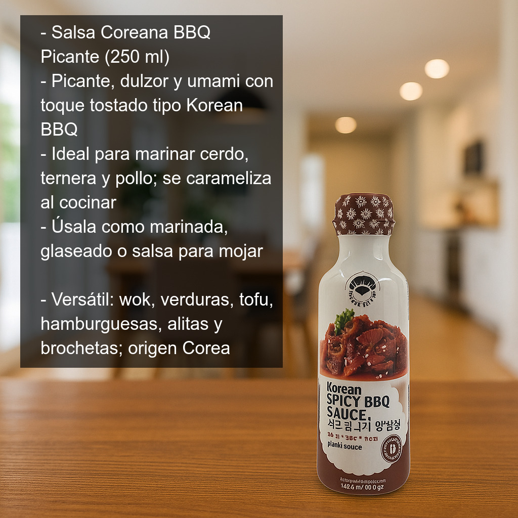 La Salsa Coreana BBQ Picante (250 ml) lleva a tu cocina el sabor inconfundible del Korean BBQ: una combinación adictiva de picante, dulzor y umami con ese toque tostado y profundo típico de las barbacoas coreanas. Inspirada en recetas tradicionales, es una salsa intensa y equilibrada, perfecta para quienes buscan dar personalidad a sus platos con un auténtico aire asiático.