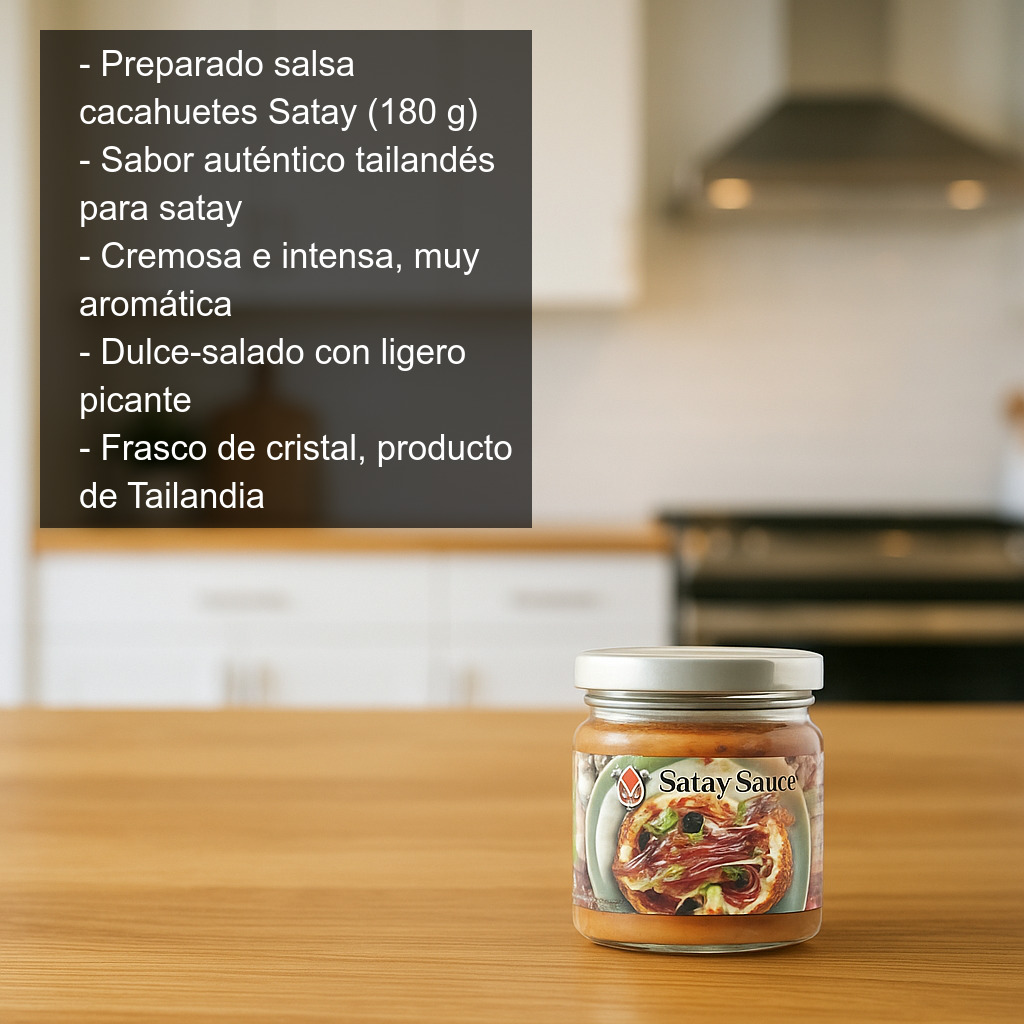 Los satays son, junto con el Pad Thai y los currys rojo, verde y amarillo, uno de los platos más conocidos y representativos de la cocina tailandesa. Esta salsa está pensada para que puedas recrear ese sabor en casa de forma rápida, sin necesidad de preparar desde cero una mezcla de especias o una base de cacahuete.