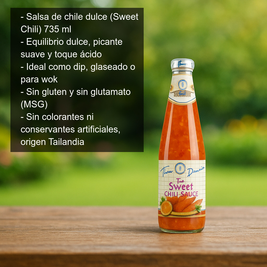 Si buscas una salsa de chile dulce tailandesa para acompañar tus platos favoritos, cocinar recetas asiáticas en casa o tener un dip rápido y delicioso, este formato grande de 735 ml es una opción práctica y muy rentable para el día a día.