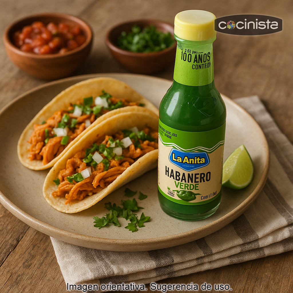 La salsa de chile habanero verde destaca por su perfil vivo y vegetal, con notas cítricas y un picor medio que aparece rápido y se mantiene agradable en boca. Es una opción excelente para realzar platos sin tapar el sabor de los ingredientes.