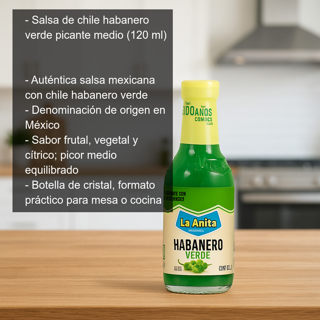 Salsa de chile habanero verde de picante medio (120 ml). Una salsa mexicana auténtica elaborada con chile habanero verde, ideal para dar un toque intenso, aromático y fresco a tus recetas.
