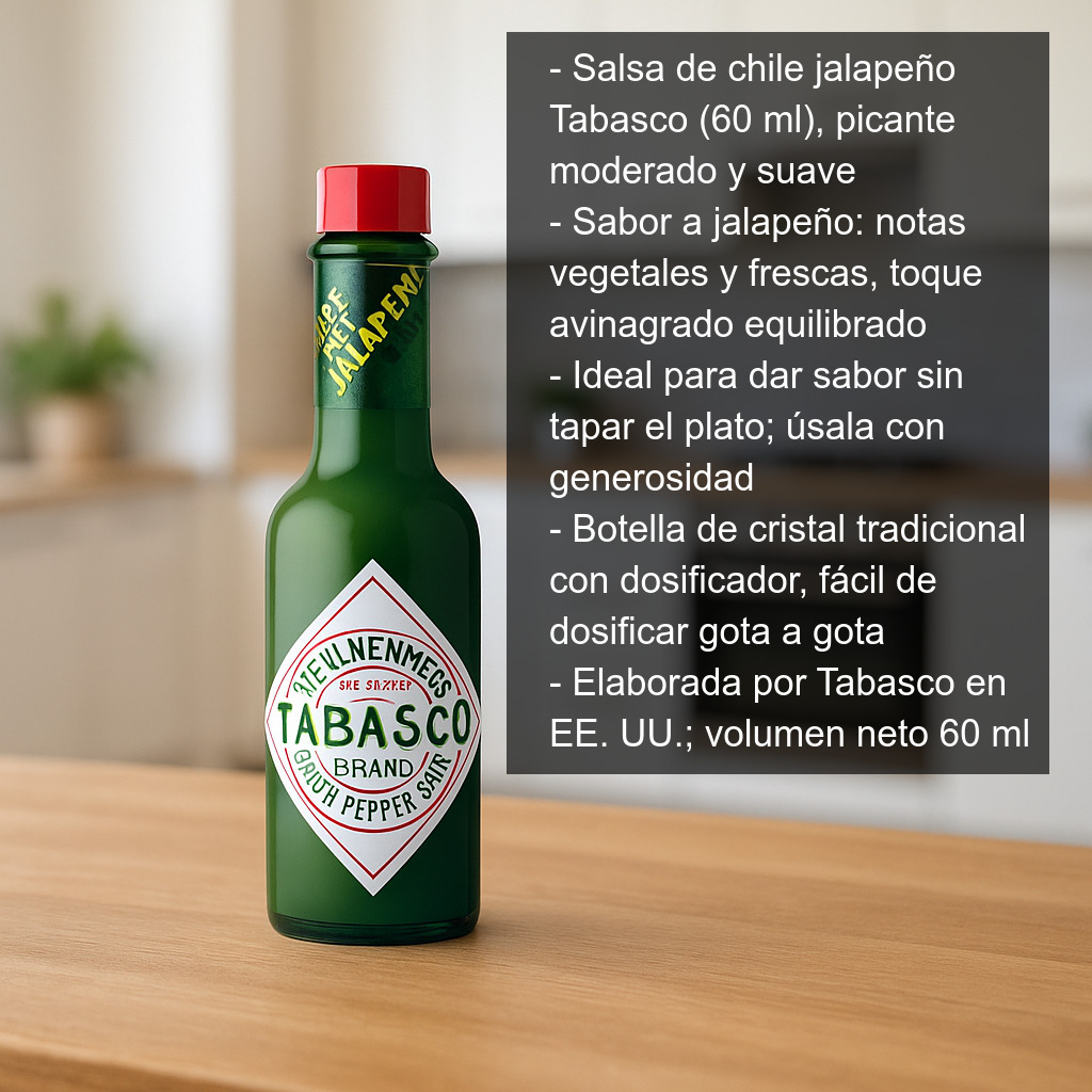 Salsa de chile jalapeño Tabasco (60 ml): una salsa de jalapeño suave, aromática y muy sabrosa, pensada para usarla con generosidad. A diferencia de la Tabasco clásica “roja”, esta variedad ofrece un picante más moderado y un perfil más vegetal, con el característico sabor del pimiento jalapeño y un toque avinagrado equilibrado.