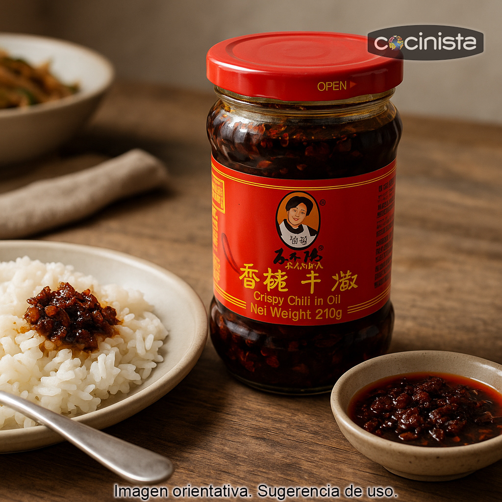 La salsa de chiles crujiente Laoganma (conocida internacionalmente como crispy chilli in oil) es uno de los condimentos chinos más populares para quienes buscan picante intenso y, sobre todo, una textura irresistible. Esta versión destaca por su mezcla de chiles en aceite y cebolla crujiente, que aporta un toque tostado y un “crunch” característico en cada cucharada.