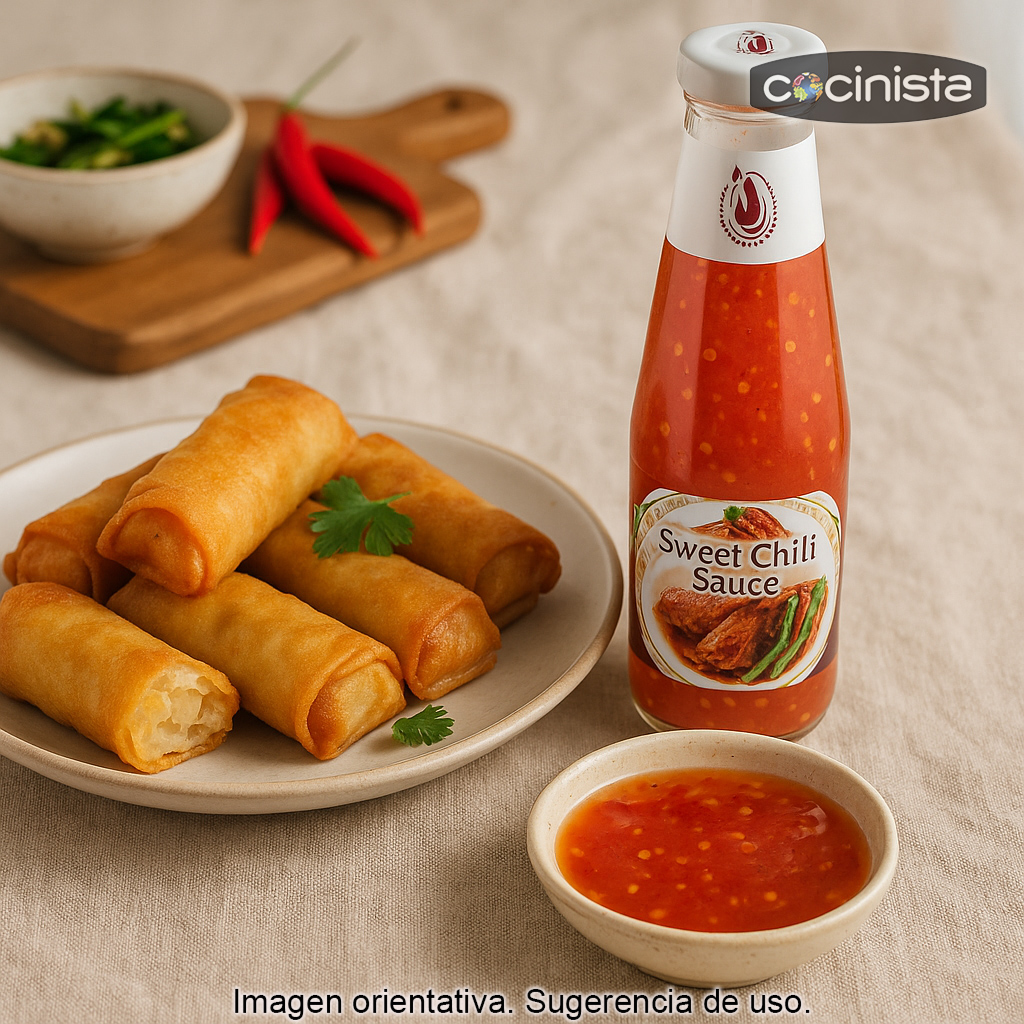 Esta sweet chili sauce acompaña de maravilla todo tipo de rollitos (spring rolls), mariscos, pescados y frituras, y también funciona como salsa para pollo, verduras a la plancha o al wok, tofu y platos de arroz o noodles. Es una opción excelente para dar un toque exótico a recetas del día a día, aportando un sabor agridulce con un final ligeramente picante.