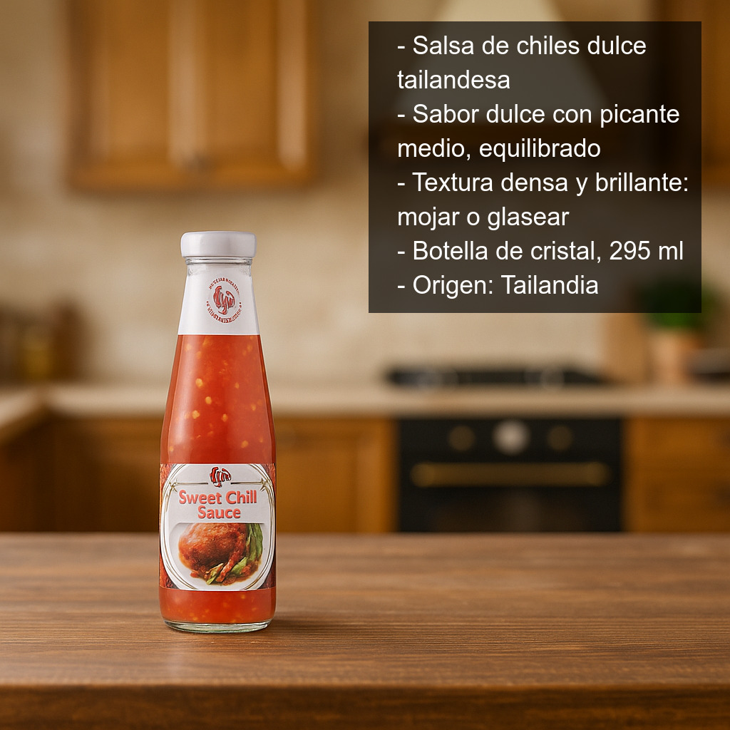La salsa de chiles dulce tailandesa es un condimento imprescindible en la cocina asiática. Elaborada a base de chiles y con un agradable toque dulce, ofrece un equilibrio perfecto entre sabor y picante: nivel medio, ideal para quienes buscan alegrar sus platos sin que resulte excesivo. Su textura ligeramente densa y brillante la convierte en una salsa muy versátil, perfecta tanto para mojar como para glasear.