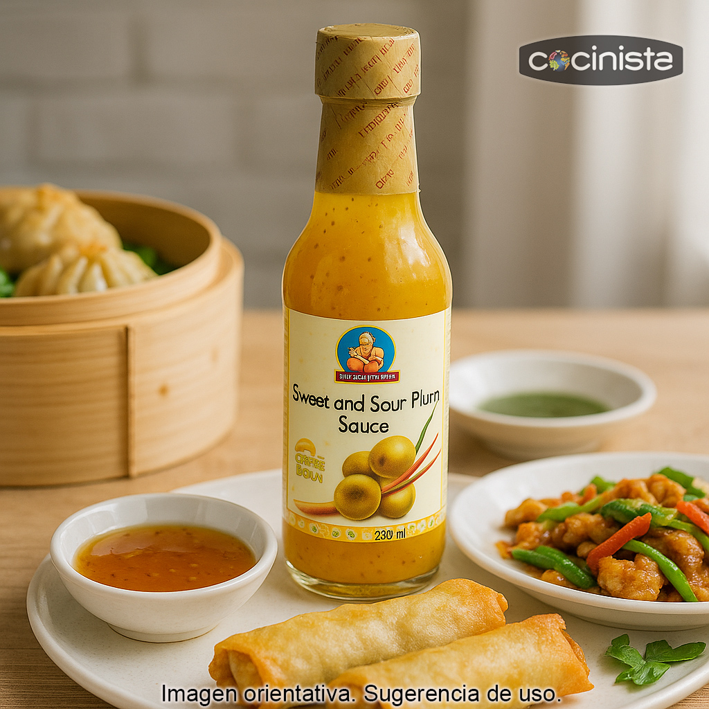 La salsa de ciruelas (conocida como plum sauce) es una de las salsas más populares de la cocina asiática, especialmente en la tradición china. Esta versión, elaborada a partir de ciruelas y vinagre de arroz (entre otros ingredientes), tiene una textura espesa y un sabor inconfundible agridulce, afrutado y ligeramente especiado, ideal para dar contraste y brillo a multitud de platos.