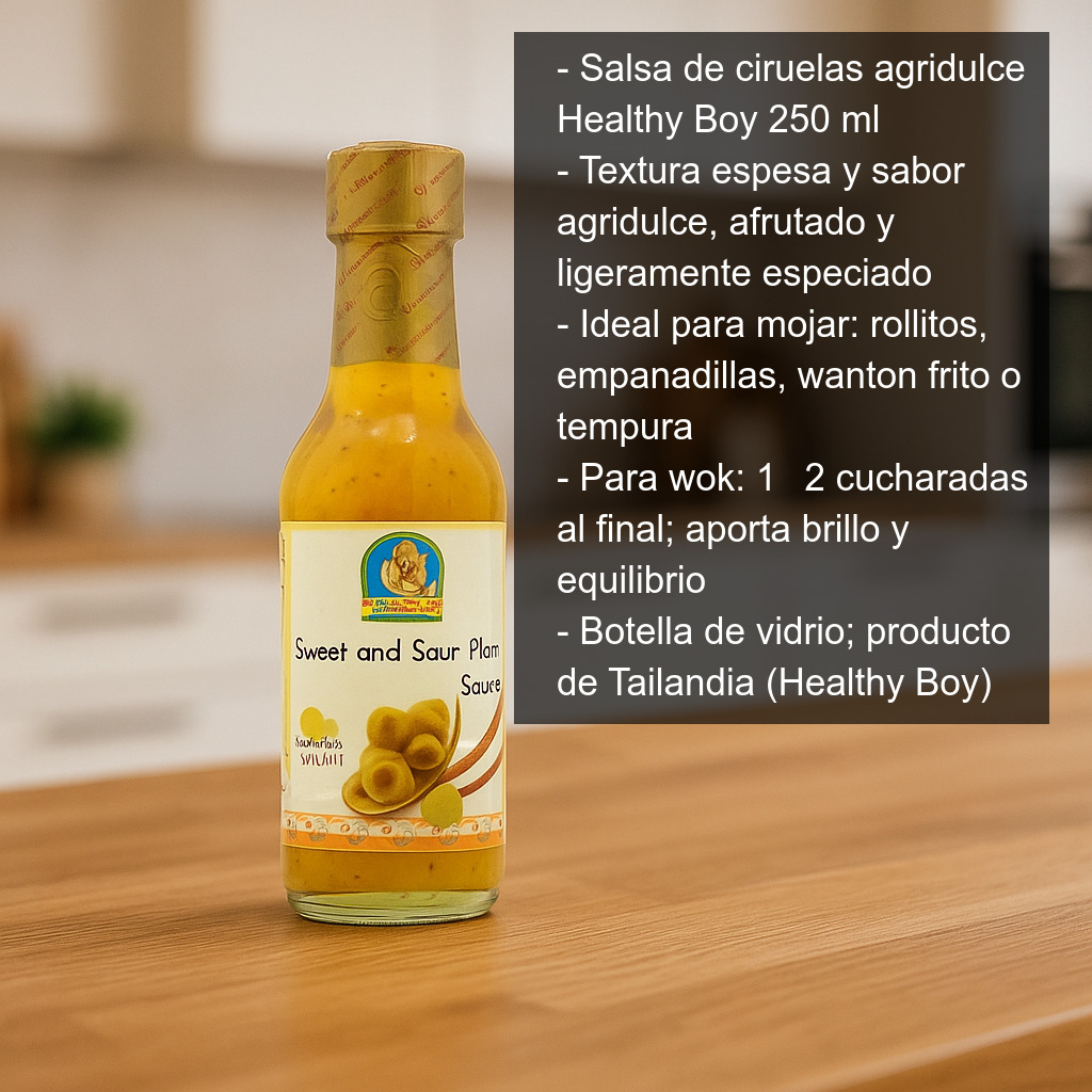 La salsa de ciruelas agridulce se presenta en botella de vidrio con 250 ml de contenido. Producto de Tailandia, fabricado por Healthy Boy.