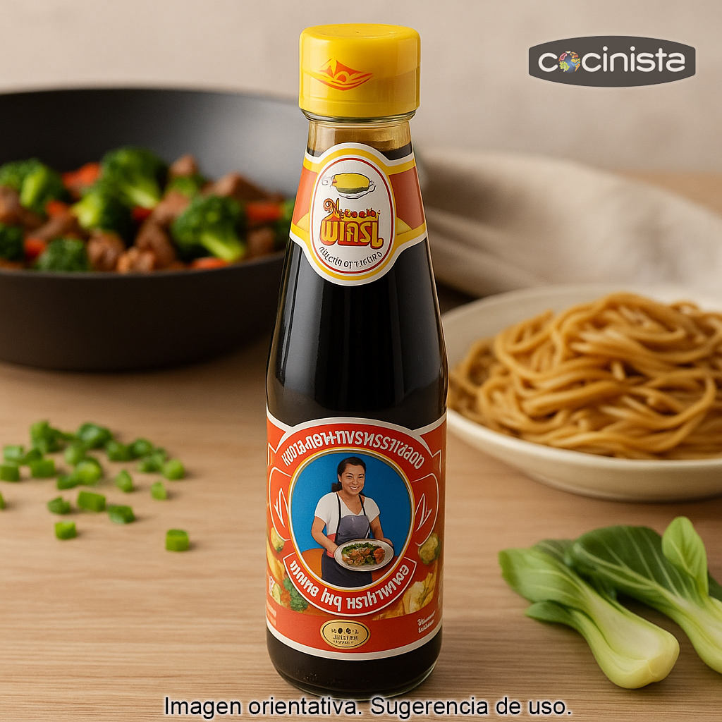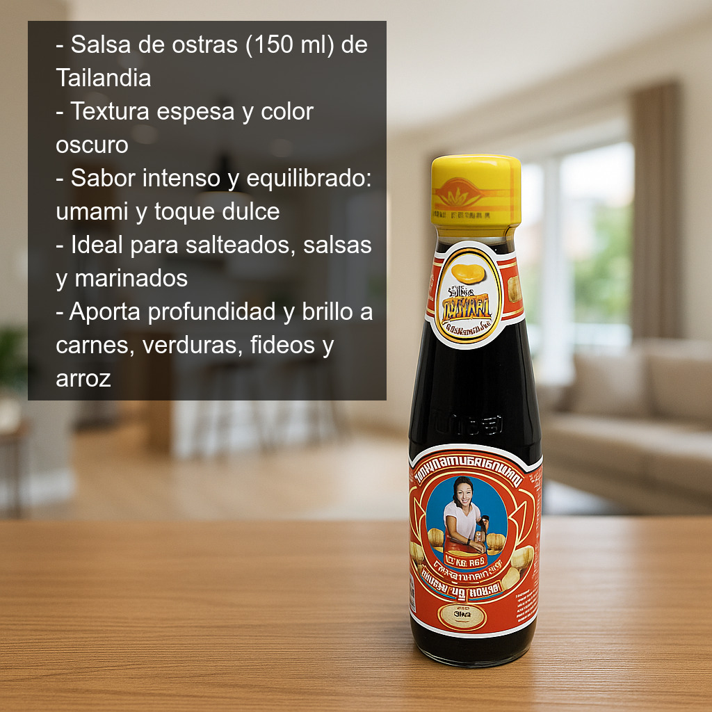 La salsa de ostras es un condimento asiático imprescindible, especialmente popular en la cocina china y muy utilizado también en otras cocinas del Sudeste Asiático. Se caracteriza por su textura espesa, su color oscuro y un sabor intenso y equilibrado, con notas umami y un toque ligeramente dulce. Es ideal para aportar profundidad y brillo a salteados y salsas, realzando el sabor de carnes, verduras y fideos.